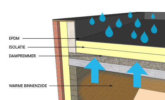 Omdat EPDM relatief dampdicht is, moeten damptechnische fouten altijd vóór plaatsing worden opgelost, niet erna.